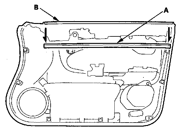 10. If necessary, remove the door glass inner weatherstrip (A) from the door panel (B) by pulling it down.
