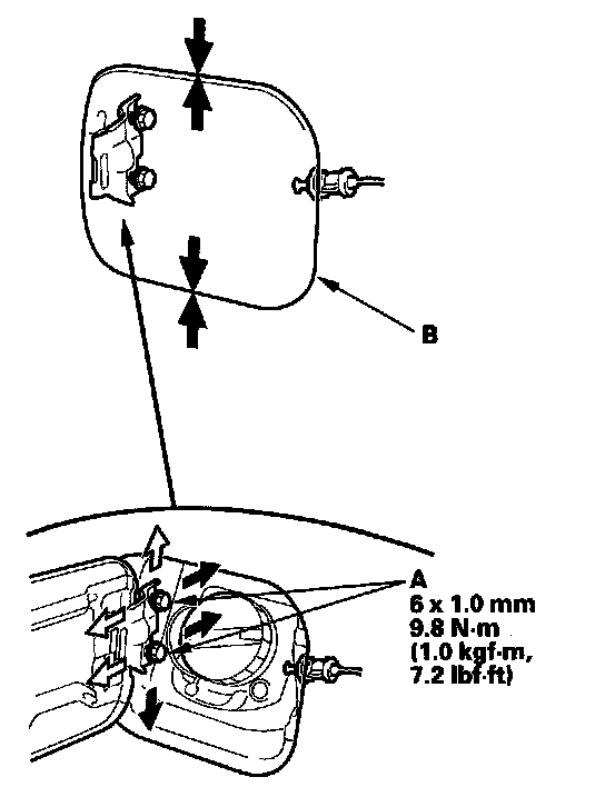 2. Adjust the fuel fill door (B) in or out until it's flush with the body, and up or down as necessary to equalize the gaps.