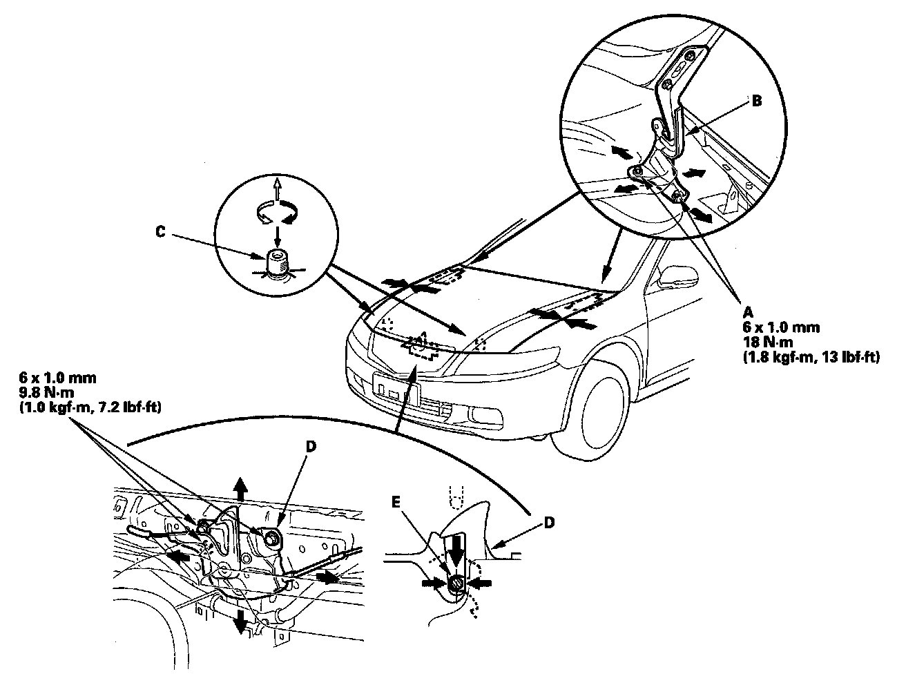 4. Remove the front grille cove, and remove the hood latch cover. Adjust the hood latch (D) to obtain the proper height at the forward edge, and move the hood latch right or left until the striker (E) is centered in the hood latch.