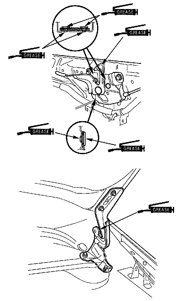 8. Apply multipurpose grease to the hood latch and hood hinge as indicated by the arrows.