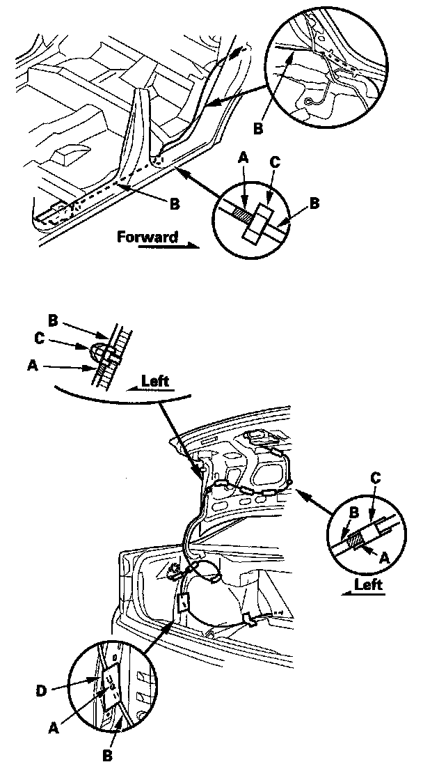 Trunk Lid Opener Cable/Fuel Fill Door Opener Cable ReplacementSRS components are located in this area. Review the SRS component locations and the precautions and procedures before doing repairs or service.