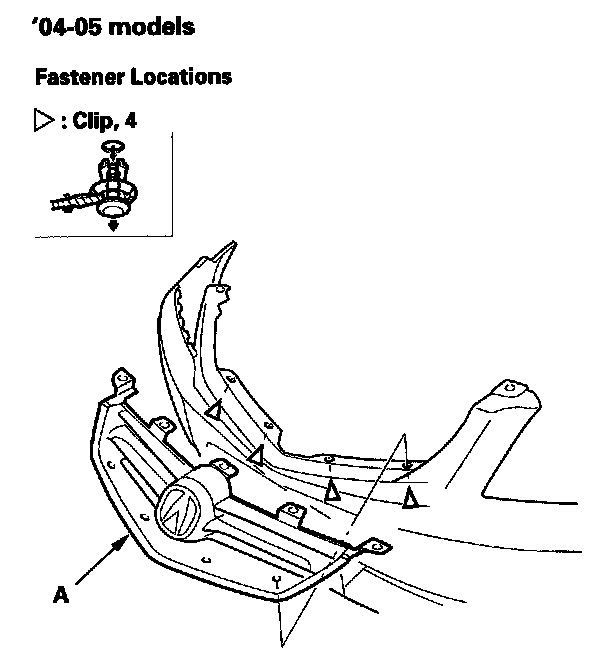 3. Remove the clips, then remove the front grille (A). Take care not to drop the clips inside the front bumper.