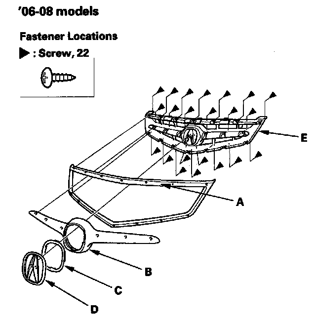 4. If necessary, remove the screws, then remove the front grille molding (A), center grille molding (B), emblem ring (C), emblem (D), from the front grille cover (E).