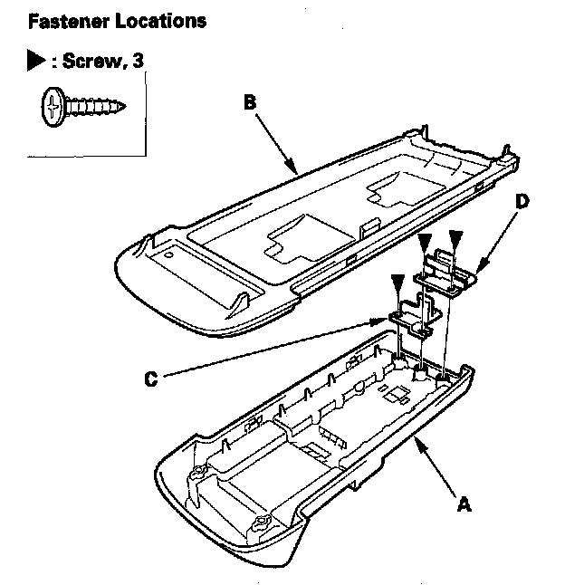 8. Separate the console armrest upper base (A) from the lower base (B). Remove the screws, then remove the armrest lock (C) and the tray lock (D) from the upper base.