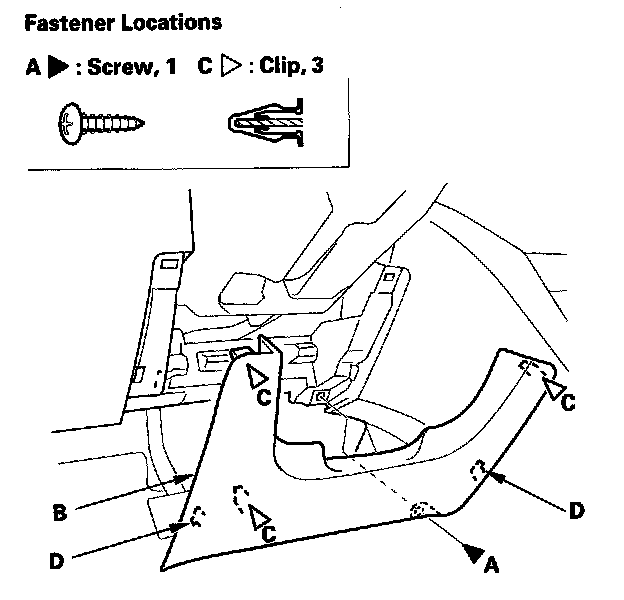 2. Remove the screw (A). Gently pull out on the lower edge of the dashboard lower cover (B) to detach the clips (C) and hooks (D).