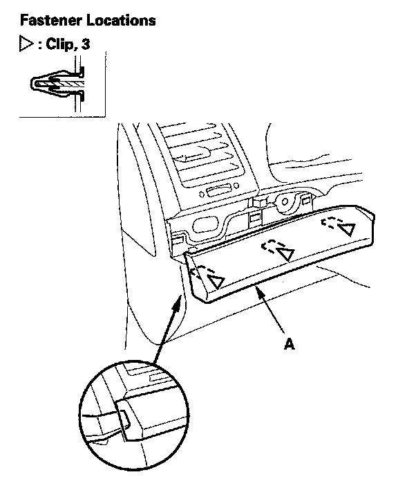 1. Pry upon the outside edge of the driver's outer dashboard trim (A) with a trim tool to detach the clips, then remove the trim.