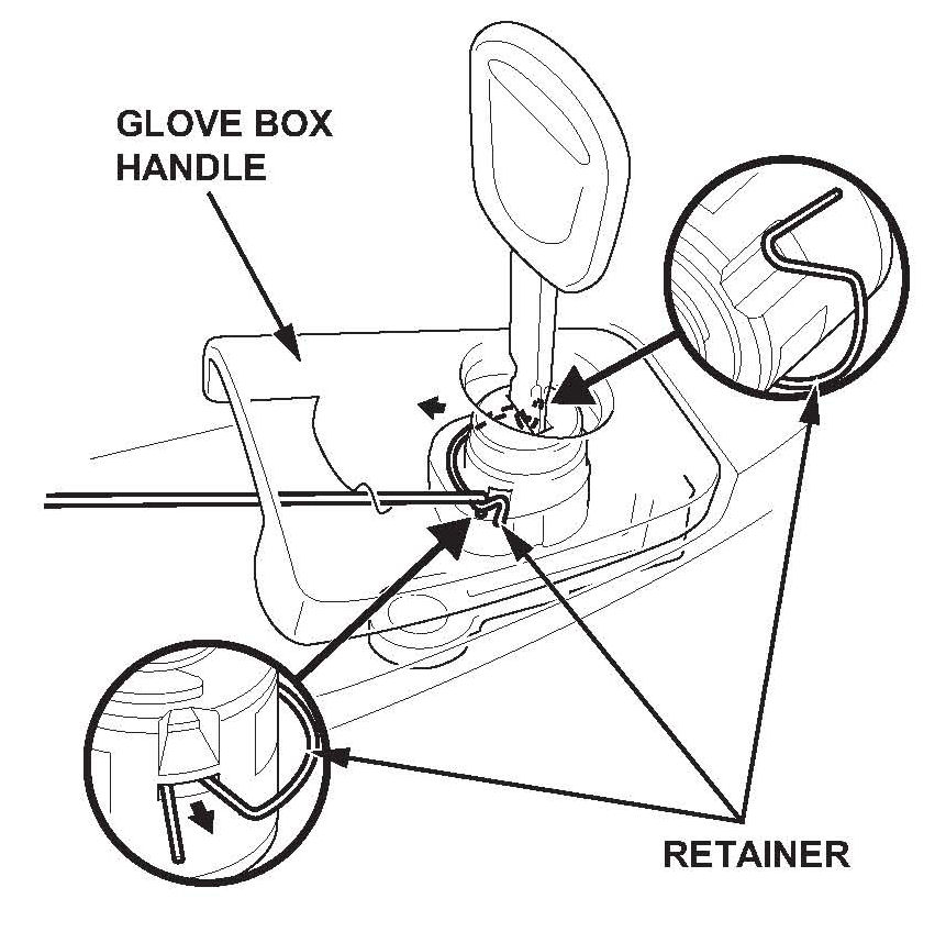 4. Insert the key into the lock cylinder. Lift the glove box handle, and use a hook-shaped tool to pull one end of the retainer out of its slot.