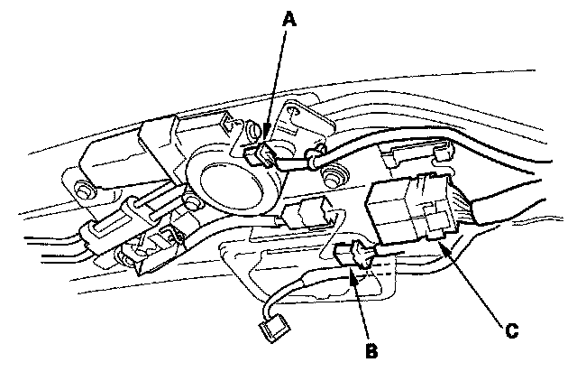3. Put on gloves to protect your hands. Disconnect the motor connector (A), open/close-tilt/close switch connector (B), and remove the moonroof relays (C).