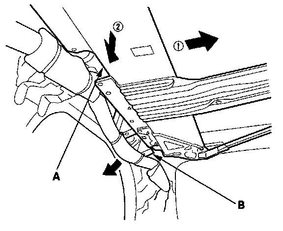 7. With the help of an assistant, move the frame (A) to the left or right, then lower the opposite side of rear grab handle down. If equipped, keep the rear grab handle bracket (B) away from the frame while lowering the frame. Take care not to hang the frame on the bracket.