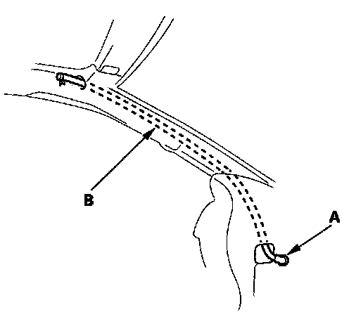 Tie a string to the top end of the rear drain tube (B), then pull back the trunk side trim panel and pull the drain tube down out of the pillar leaving the string inside the pillar.