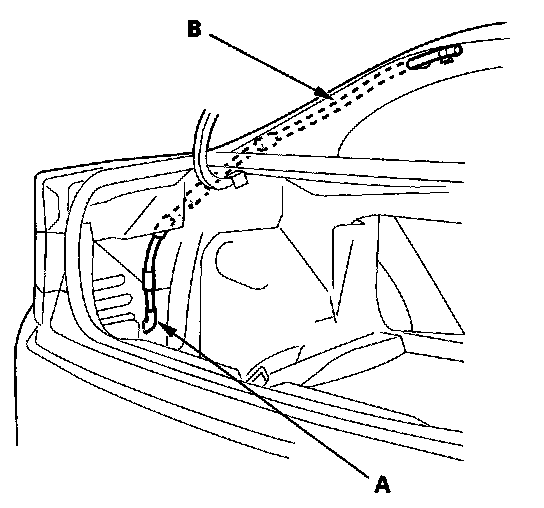 9. To remove a front drain valve (A) from the body, remove the kick panel, left or right. Tie a string to the top end of the drain tube, then pull the front drain tube (B) down out of the A-pillar leaving the string inside the pillar.