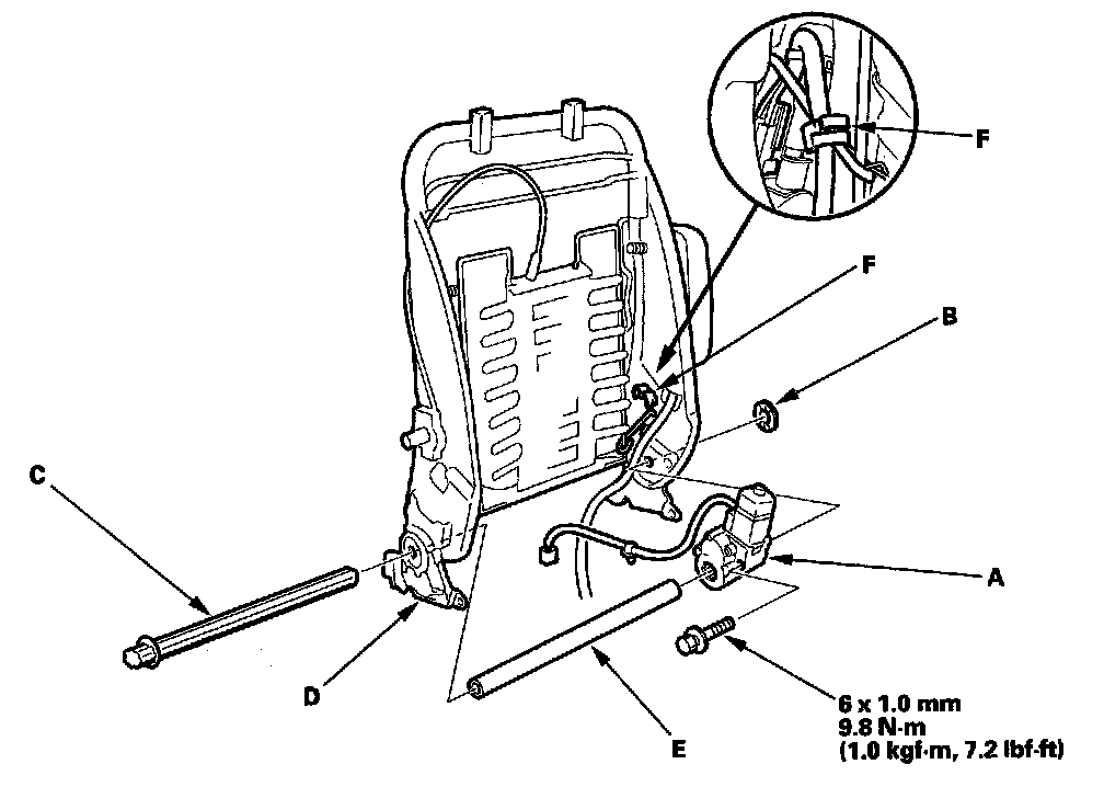 4. Remove the bolt and clamp (F), then remove the recline motor.