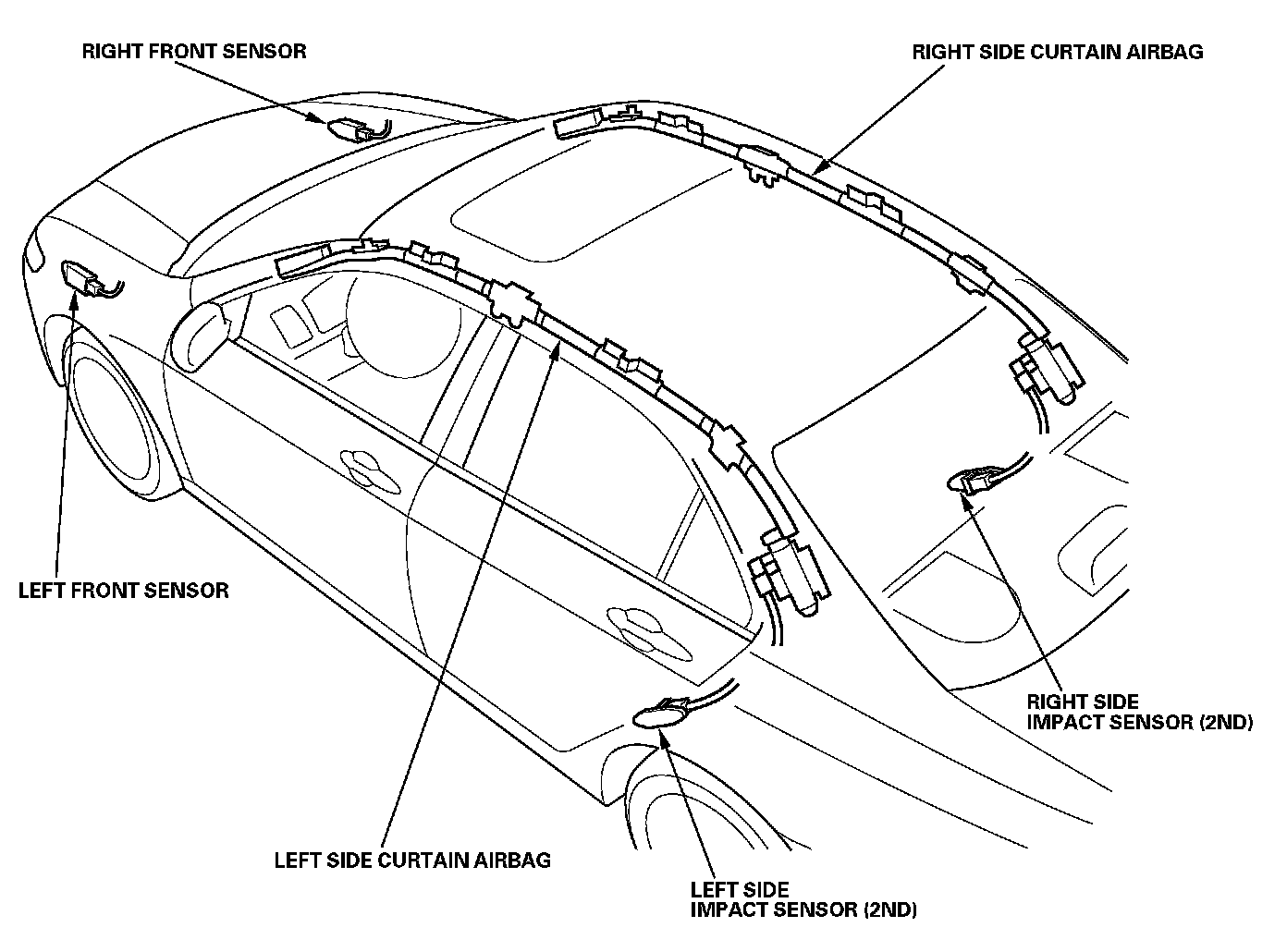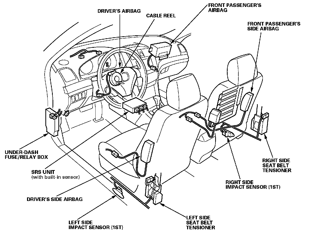 Supplemental Restraint System (SRS)This model has an SRS which includes a driver's airbag in the steering wheel hub, a passenger's airbag in the dashboard above the glove box, seat belt tensioners in the front seat belt retractors, side airbags in the front seatbacks,and side curtain airbags in the side of the roof side. The SRS unit is separate from the airbag assembly and has built-in sensors. The following precautions should be observed when performing sheet meal work, paint work, and repair work around the locations of the SRS component