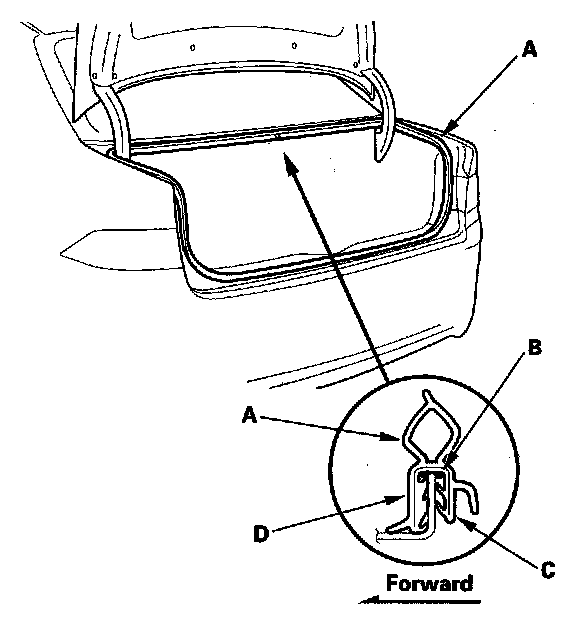 Trunk Lid Weatherstrip Replacement1. Remove the trunk lid weatherstrip (A) by pulling it off.