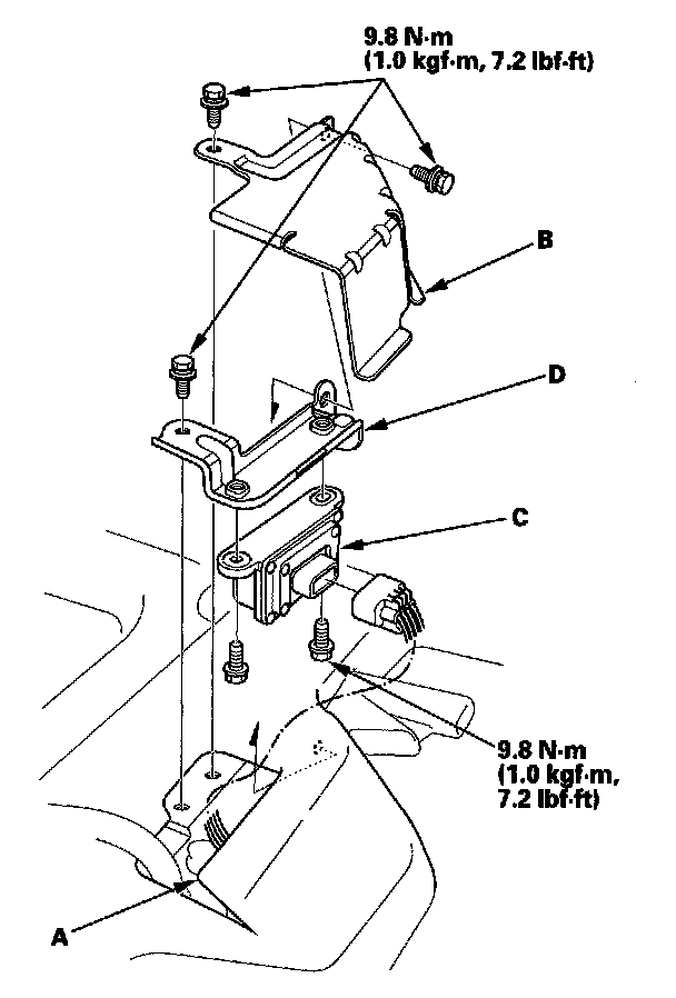 5. Remove the yaw rate-lateral acceleration sensor (C) with the bracket (D).
