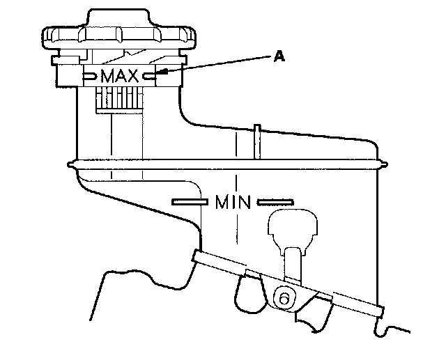 1. Make sure the brake fluid level in the reservoir is at the MAX (upper) level line (A).
