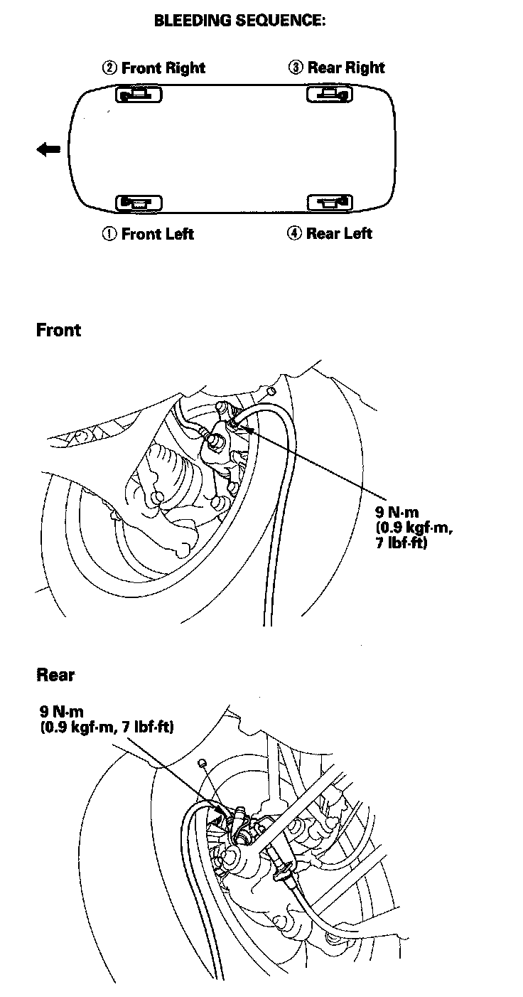 5. Repeat the procedure for each wheel in the sequence shown following until air bubbles no longer appear in the fluid.