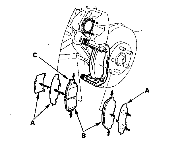 14. Install the brake pads and pad shims correctly. Install the pad with the wear indicator (C) on the upper inside. If you are reusing the brake pads, always reinstall the brake pads in their original positions to prevent a momentary loss of braking efficiency.