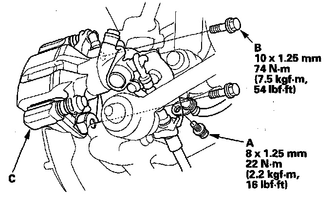 4. Remove the brake caliper bracket mounting bolts (B), then remove the caliper assembly (C) from the knuckle. To prevent damage to the caliper assembly or brake hose, use a short piece of wire to hang the caliper assembly from the undercarriage. Do not twist the brake hose excessively.