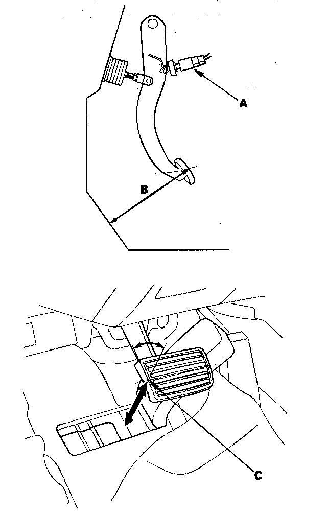1. With the engine off, inspect the play (A) on the brake pedal pad (B) by pushing the brake pedal by hand. If the brake pedal free play is out of specification, adjust the brake pedal position switch (C). If the brake pedal free play is insufficient, it may result in brake drag.
