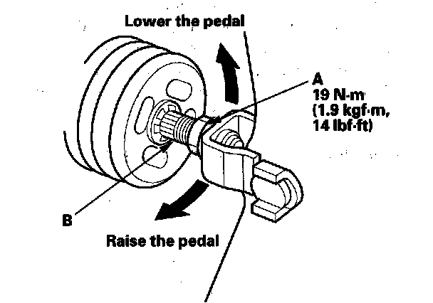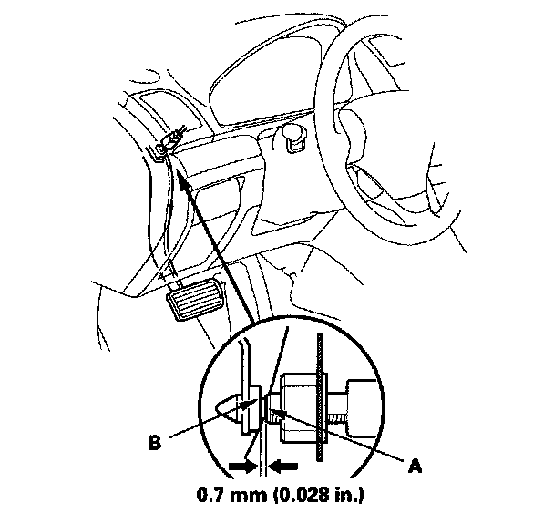 4. Lift up on the brake pedal by hand. Push in the brake pedal position switch until its plunger is fully pressed (threaded end (A) touching the pad (B) on the pedal arm). Then, turn the switch 45°clockwise to lock it. The gap between the brake pedal position switch and the pad is automatically adjusted to 0.7 mm (0.028 in.) by locking the switch. Make sure the brake lights go off when the pedal is released.