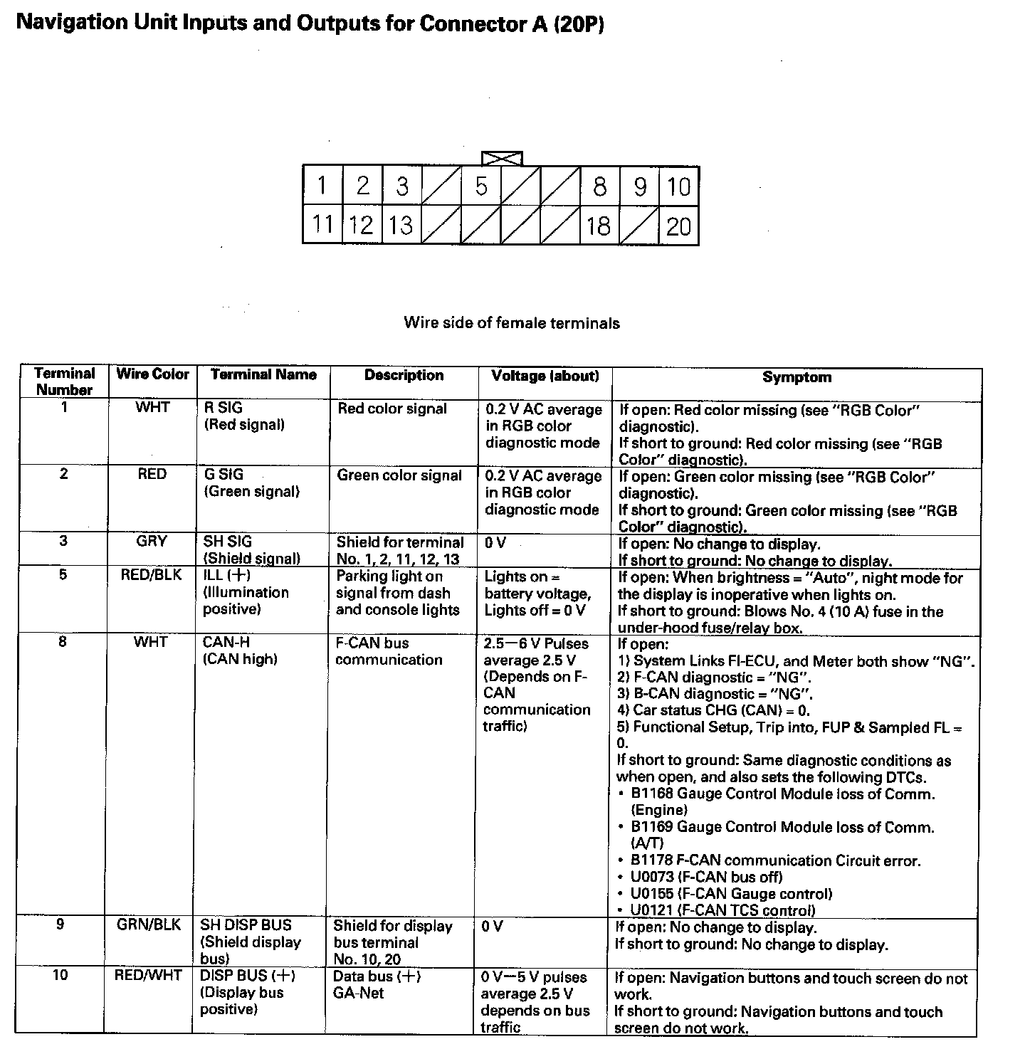 Navigation Unit Inputs And Outputs For Connector A (20P) (Part 1):