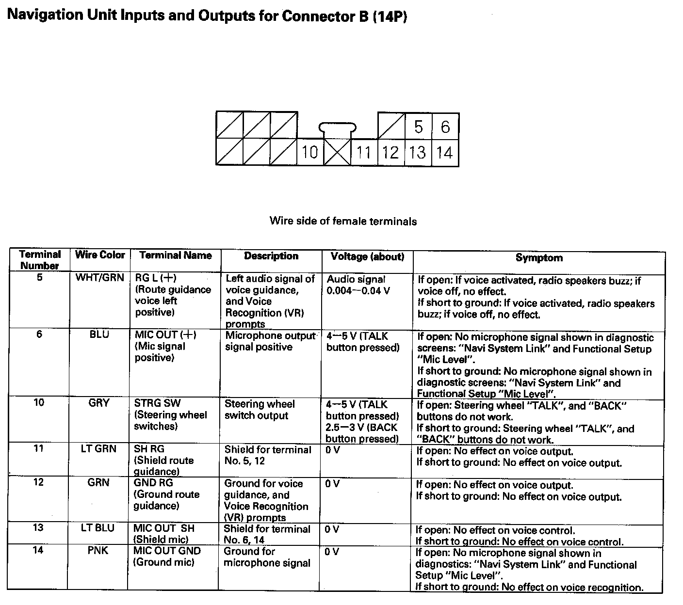 Navigation Unit Inputs And Outputs For Connector B (14P):