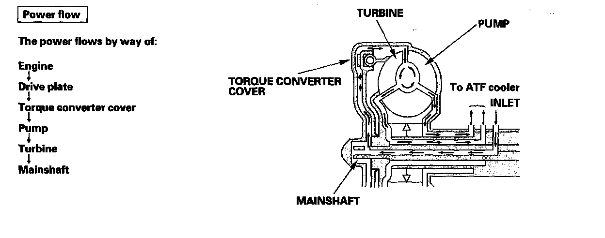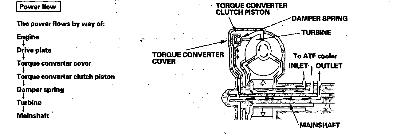 Lock-up SystemThe lock-up mechanism of the torque converter clutch operates in D (2nd, 3rd, 4th, and 5th gears), in D3 (2nd and 3rd gears), and M (sequential shift mode) (3rd, 4th, and 5th gears). The pressurized fluid is drained from the back of the torque converter through a fluid passage, causing the torque converter clutch piston to be held against the torque converter cover. As this takes place, the mainshaft rotates at the same speed as the engine crankshaft. Together with the hydraulic control, the PCM optimizes the timing and volume of the lock-up mechanism. When shift solenoid valve E is turned on by the PCM, shift solenoid valve E pressure switches the lock-up shift valve lock-up on and off. A/T clutch pressure control solenoid valve A and the lock-up control valve control the amount of the lock-up.