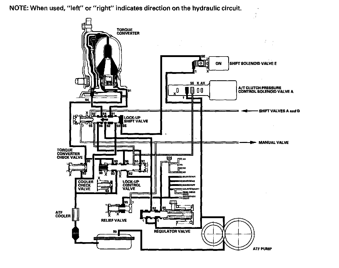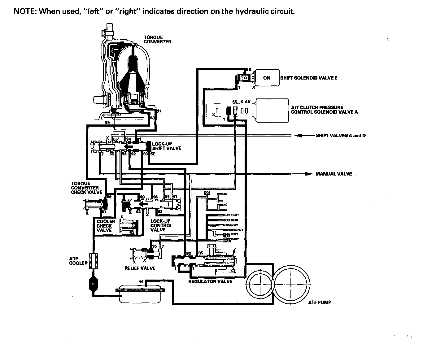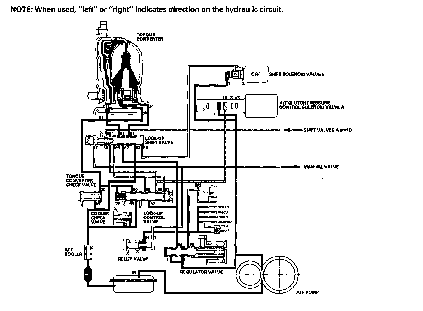 Shift solenoid valve E is turned OFF by the PCM, and shift solenoid valve E pressure (SE) is not applied to the lock-up shift valve. The lock-up shift valve remains to the right to uncover the torque converter pressure ports leading to the left side of the torque converter and releasing pressure from the right side of the torque converter. Torque converter pressure (92) changes to (94) at the lock-up shift valve, and enters into the left side of the torque converter to disengage the torque converter clutch. This keeps the torque converter clutch piston away from the torque converter cover and the torque converter lock-up clutch is OFF.
