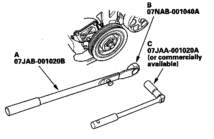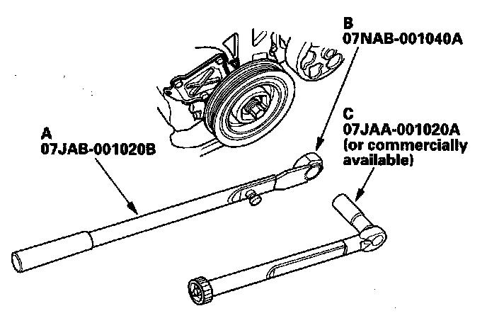 5. Remove the bolt with a 19 mm socket (C) and breaker bar, then remove the crankshaft pulley.