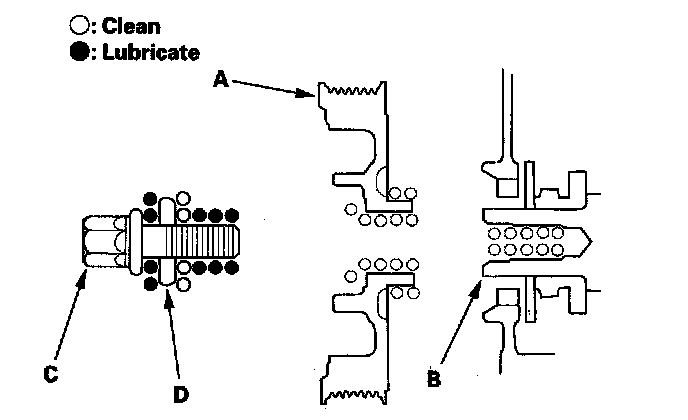 1. Clean the crankshaft pulley (A), crankshaft (B), bolt (C), and washer (D). Lubricate new engine oil as shown.