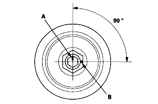 4. Mark the bolt head (A) and the crankshaft pulley (B) as shown, then tighten the bolt an additional 90°(The mark on the bolt head line up with the mark on the crankshaft pulley).