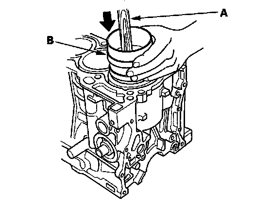4. Position the piston/connecting rod assembly in the cylinder, and tap it in using the wooden handle of a hammer (A). Maintain downward force on the ring compressor (B) to prevent the rings from expanding before entering the cylinder bore.