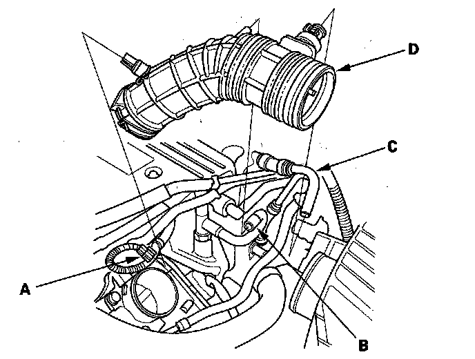 5. Disconnect the vacuum hose (B) and breather pipe (C), then remove the air intake duct (D).