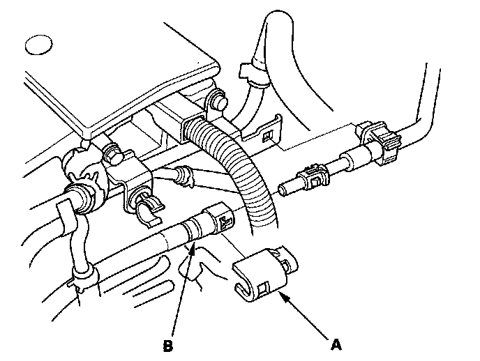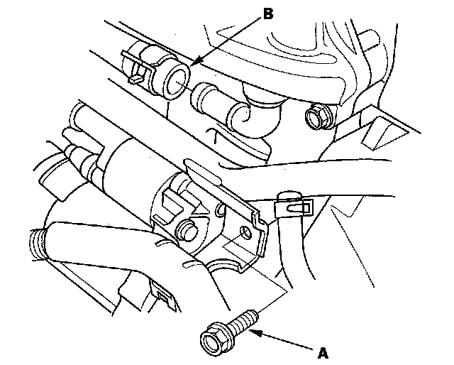 11. Disconnect the evaporative emission (EVAP) canister hose (A) and brake booster vacuum hose (B).