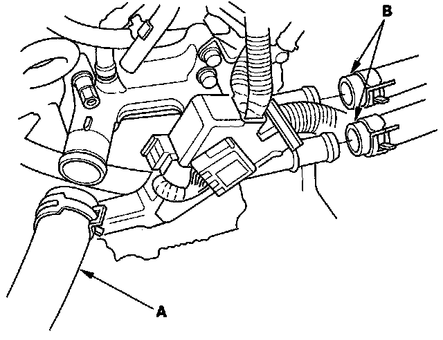13. Remove the upper radiator hose (A) and heater hoses (B).