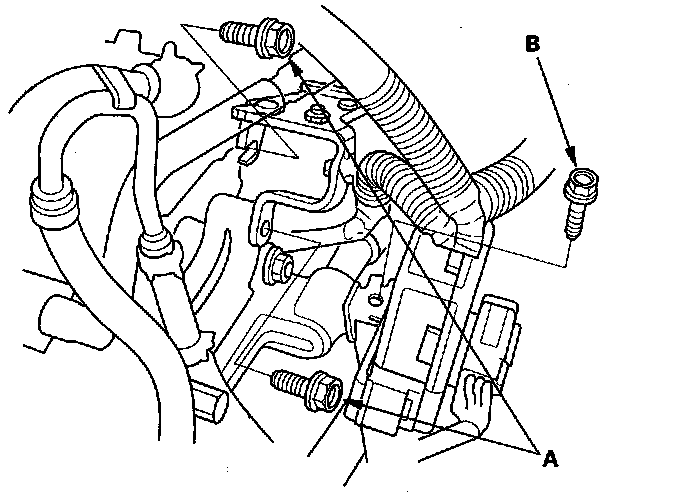 15. Remove the two bolts (A) securing the EVAP canister purge valve bracket and remove the bolt (B) securing the harness bracket.