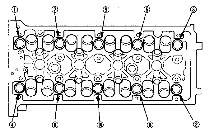 18. Remove the cylinder head bolts. To prevent warpage, loosen the bolts in sequence 1/3 turn at a time, repeat the sequence until all bolts are loosened.