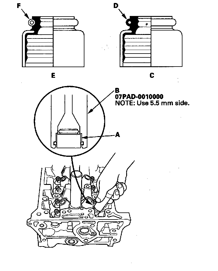 NOTE: The exhaust valve seal (C) has a black spring (D), and the intake valve seal (E) has a white spring (F). They are not interchangeable.