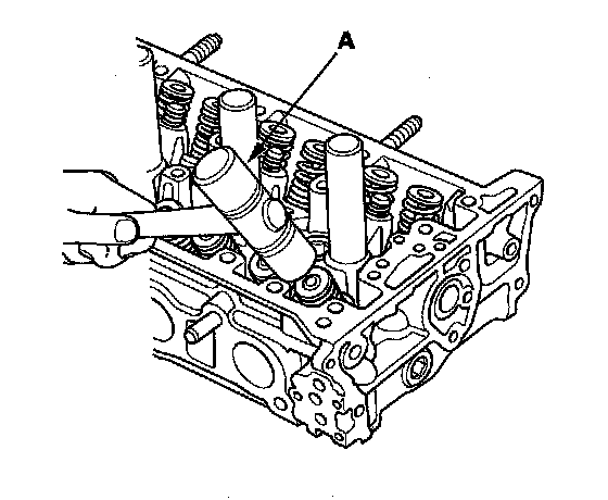 8. Lightly tap the end of each valve stem two or three times with a plastic mallet (A) to ensure proper seating of the valve and valve cotters. Tap the valve stem only along its axis so you do not bend the stem.