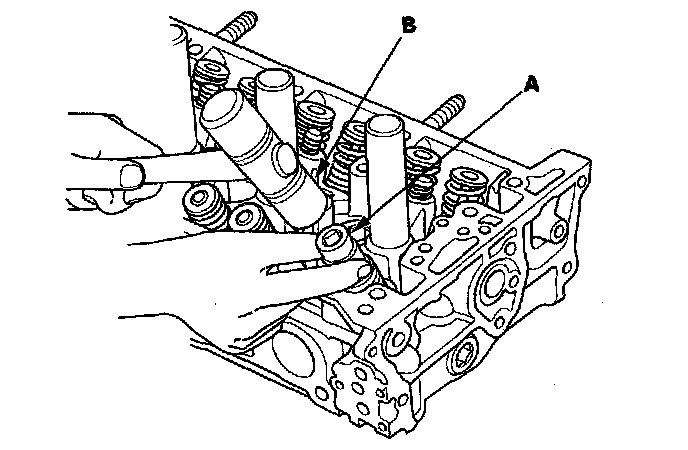 2. Using an appropriate-sized socket (A) and plastic mallet (B), lightly tap the valve spring retainer to loosen the valve cotters.