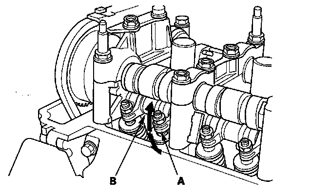 4. Move the secondary rocker arm (A) for the No. 1 cylinder. The secondary rocker arm should move independently of the mid rocker arm (B).