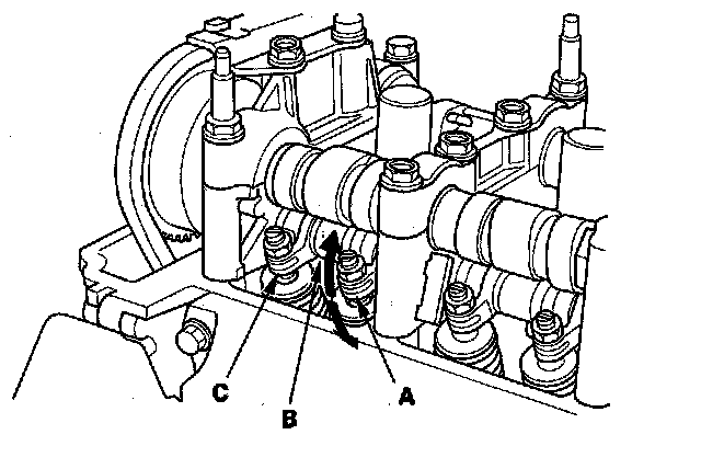 12. With the specified air pressure applied, move the secondary rocker arm (A) for the No. 1 cylinder. The mid rocker arm (B), primary rocker arm (C), and secondary rocker arm should move together.