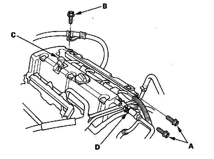 5. Remove the dipstick (C) and disconnect the breather hose (D).
