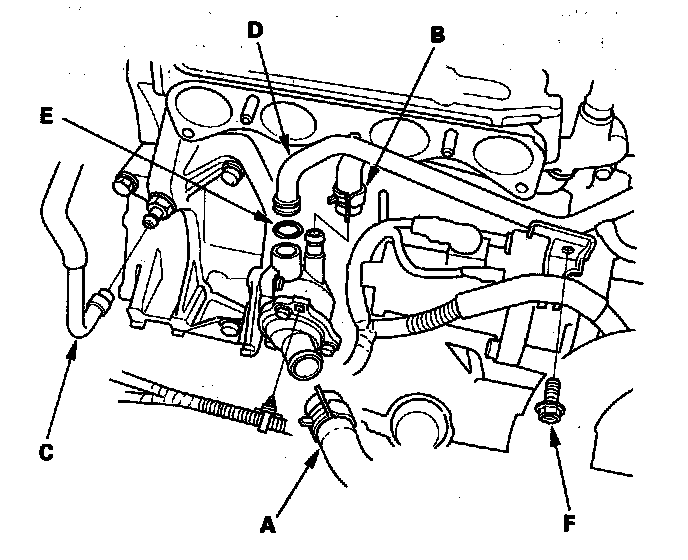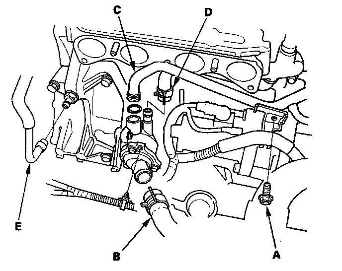 8. Disconnect the lower radiator hose (B), connecting pipe (C), water bypass hose (D), and positive crankcase ventilation (PCV) hose (E).