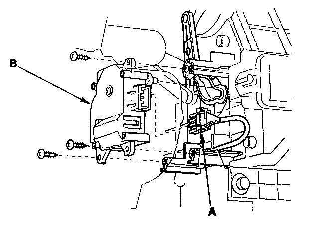 3. Disconnect the 7P connector (A) from the recirculation control motor (B). Remove the self-tapping screws and the recirculation control motor from the blower unit.