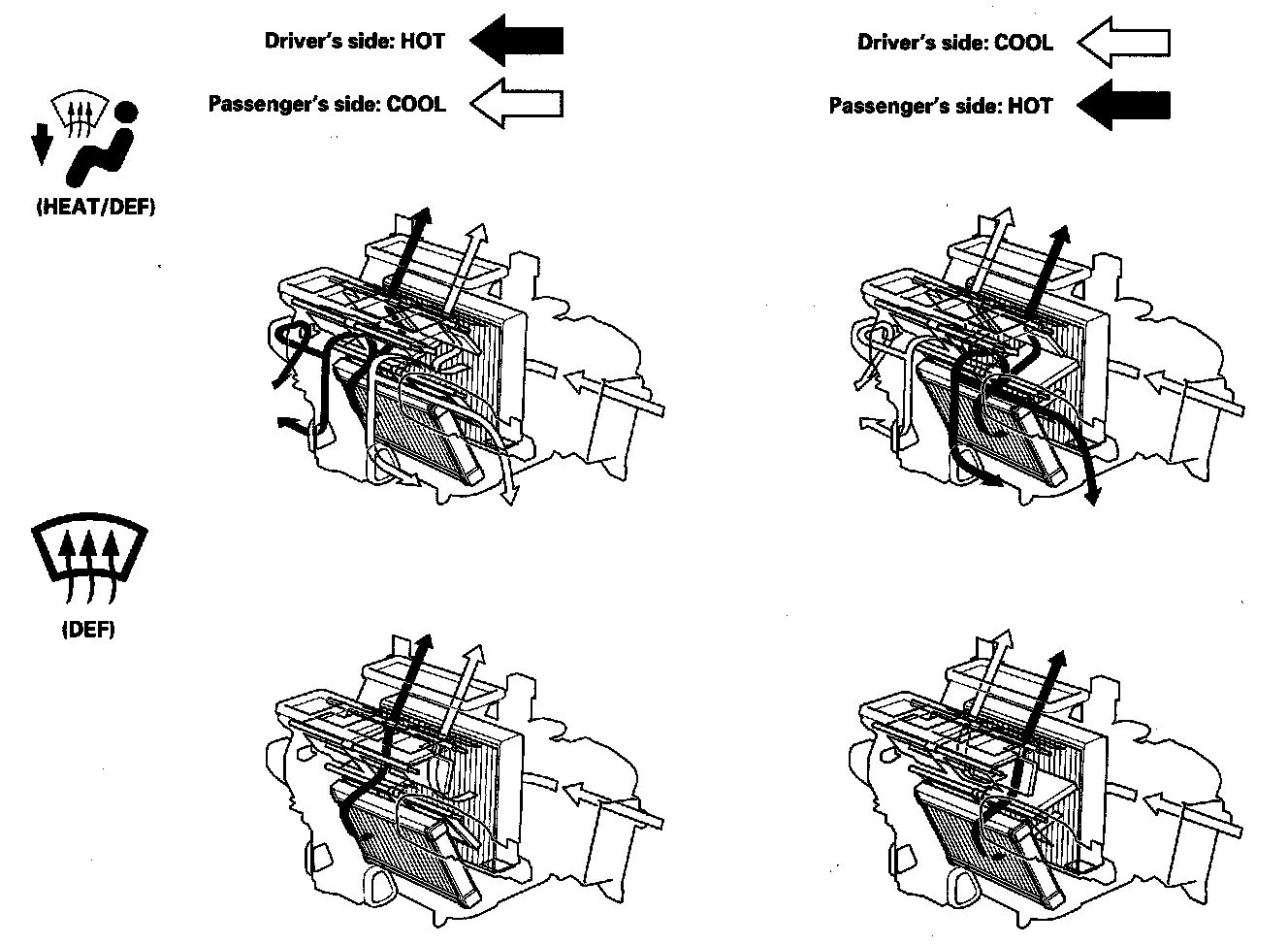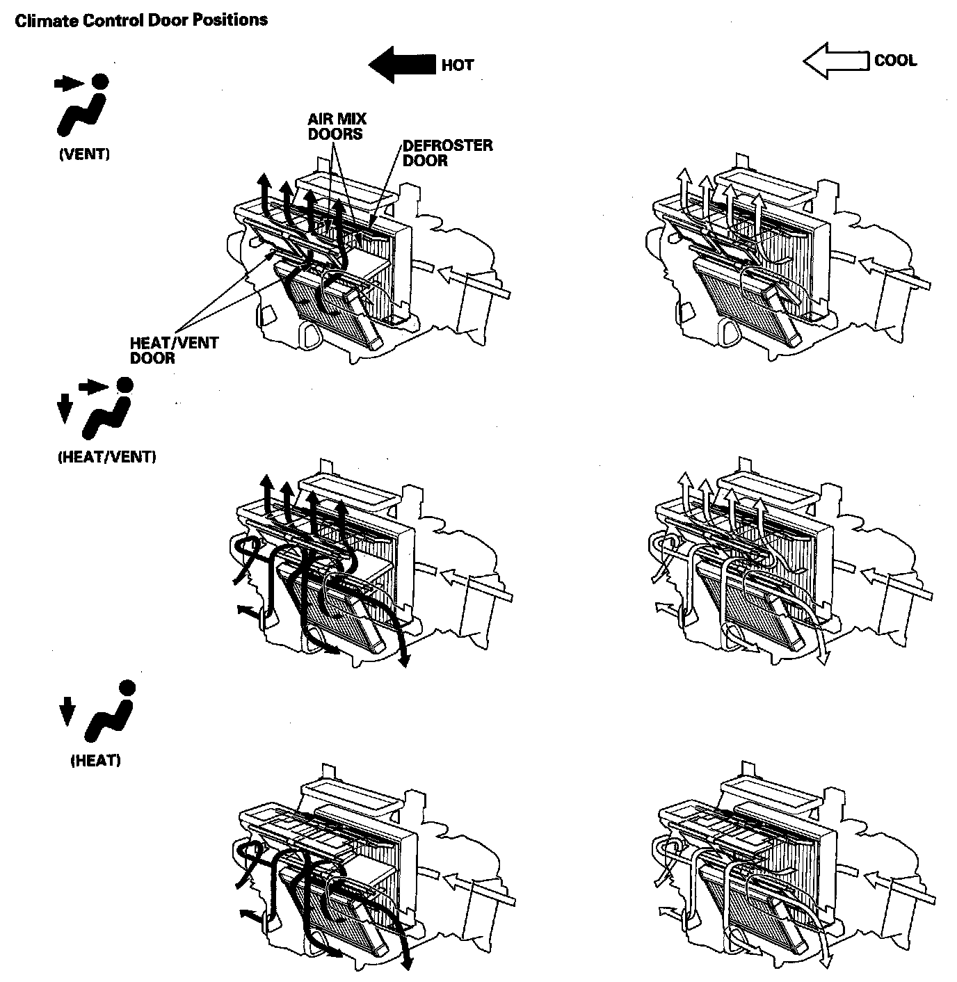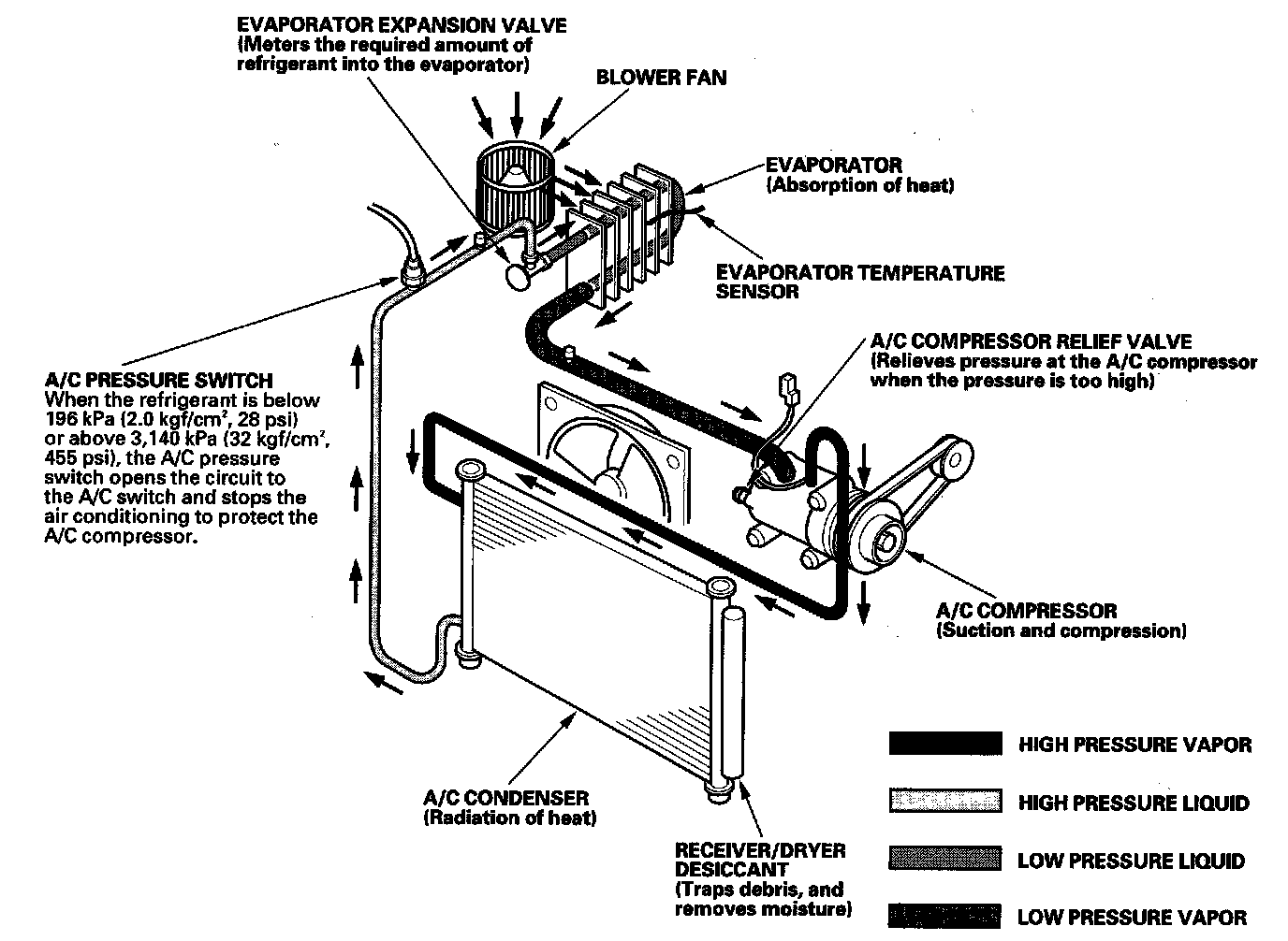 System DescriptionThe air conditioning system removes heat from the passenger compartment by transferring heat from the ambient air to the evaporator. The evaporator cools the air with the refrigerant that is circulating through the evaporator. The refrigerant expands in the evaporator, and the evaporator becomes very cold and absorbs the heat from the ambient air. The blower fan pushes air across the evaporator where the heat is absorbed, and then it blows the cool air into the passenger compartment.