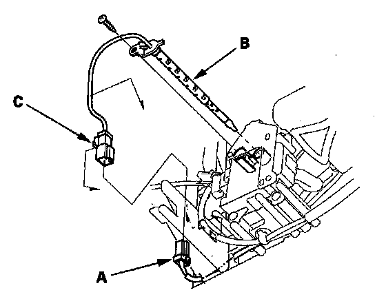 1. Disconnect the 2P connector (A) from the evaporator temperature sensor (B), then remove the connector clip (C). Remove the self-tapping screw, and carefully pull out the evaporator temperature.