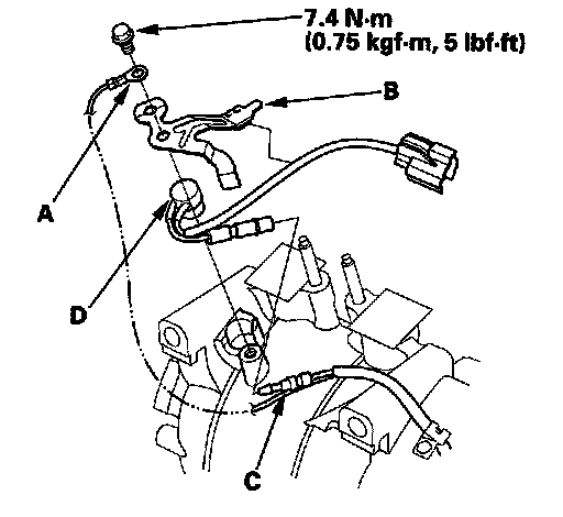 1. Remove the bolt, the ground terminal (A), and the holder (B). Disconnect the field coil connector (C), then remove the thermal protector (D).