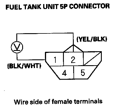 7. Measure voltage between fuel tank unit 5P connector terminals No. 1 and No. 2 with the ignition switch ON (II). There should be battery voltage.